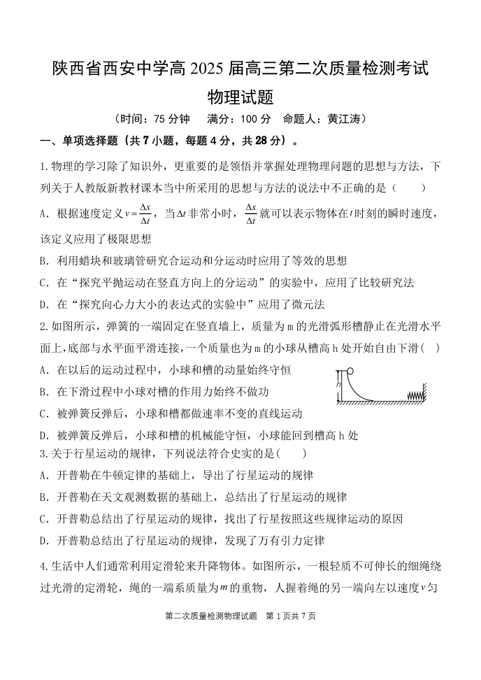 陕西省西安中学高2025届高三第二次质量检测 物理
