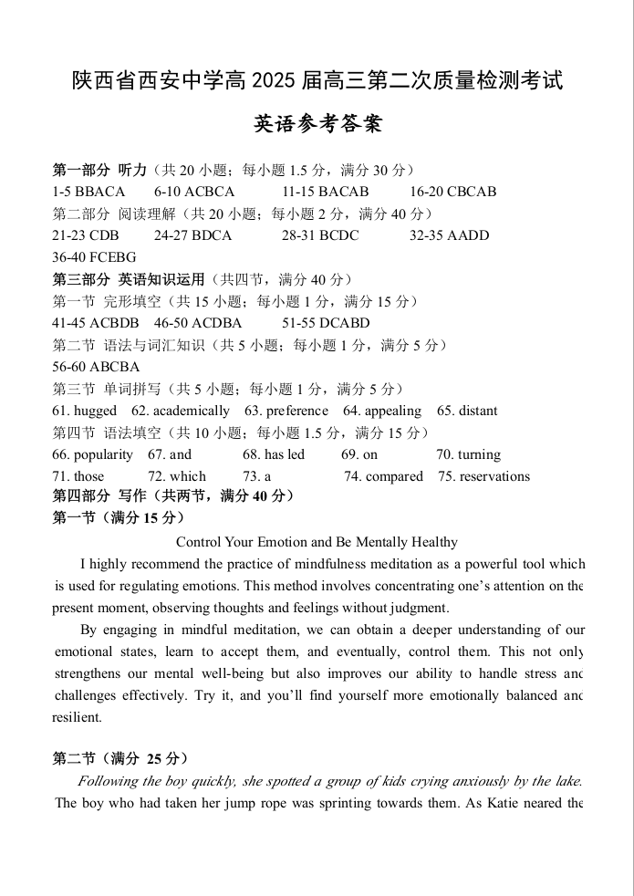陕西省西安中学高2025届高三第二次质量检测 英语答案