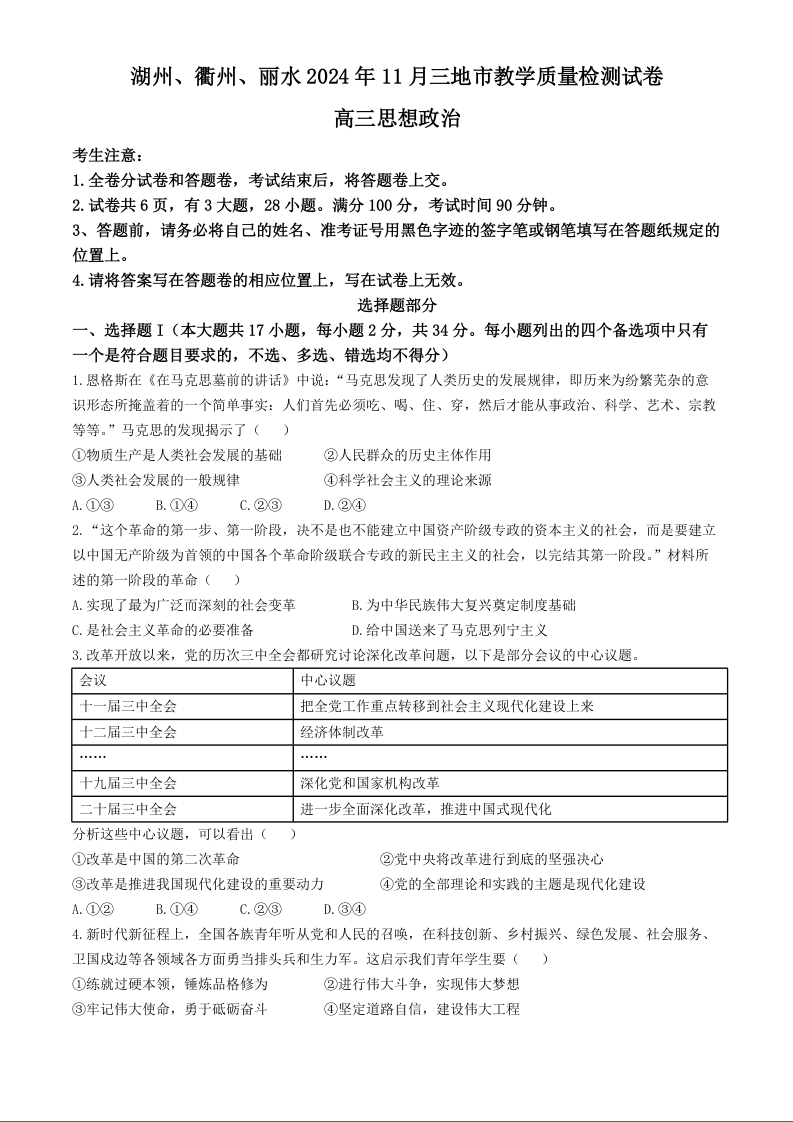 浙江省湖丽衢2024年11月三地市教学质量检测试卷 政治