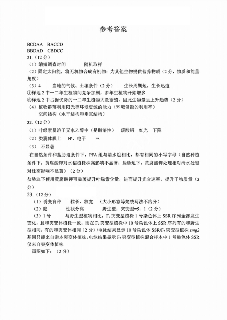浙江省湖丽衢2024年11月三地市教学质量检测试卷 生物答案