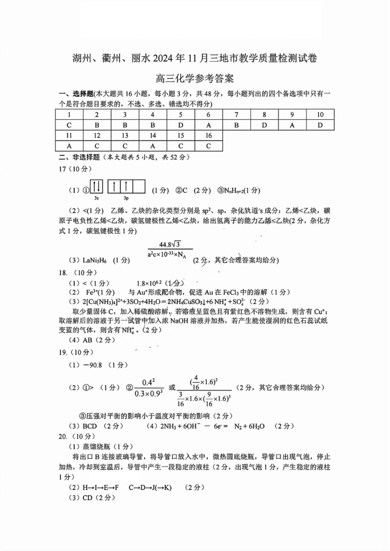 浙江省湖丽衢2024年11月三地市教学质量检测试卷 化学答案