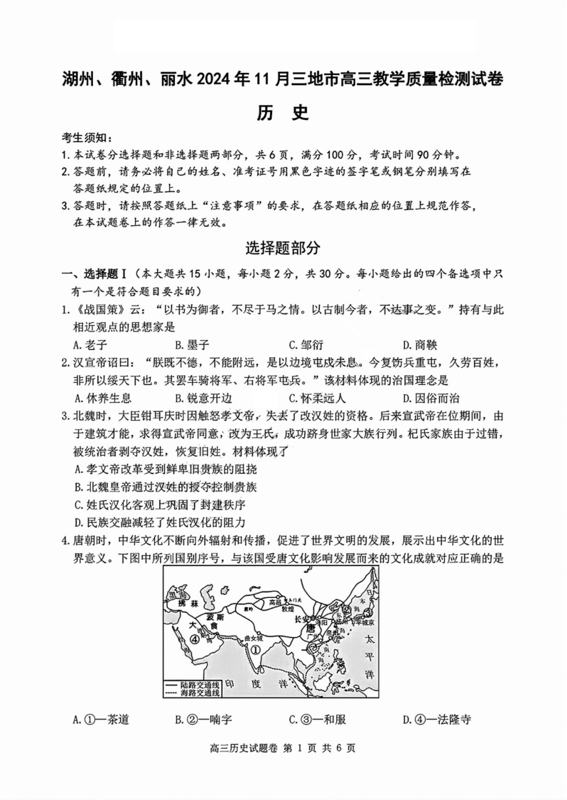 浙江省湖丽衢2024年11月三地市教学质量检测试卷 历史