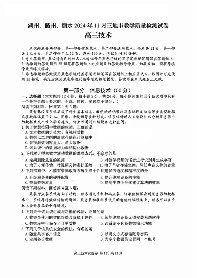 浙江省湖丽衢2024年11月三地市教学质量检测试卷 技术