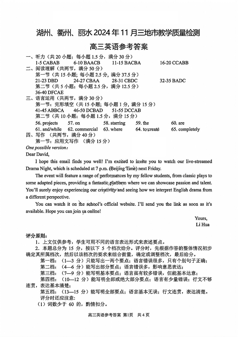 浙江省湖丽衢2024年11月三地市教学质量检测试卷 英语答案