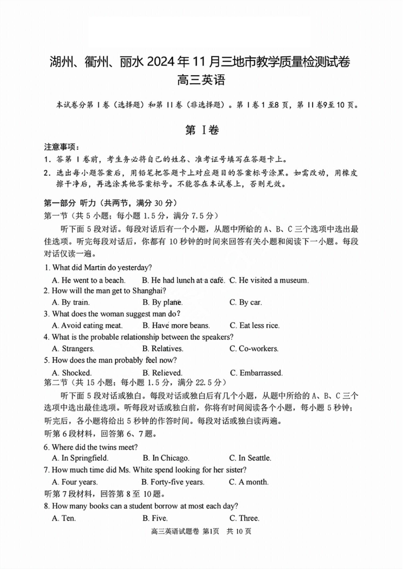 浙江省湖丽衢2024年11月三地市教学质量检测试卷 英语