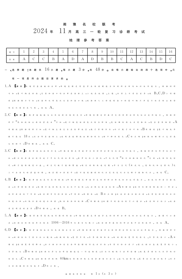 湘豫名校联考2024年11月高三一轮复习诊断考试 地理答案