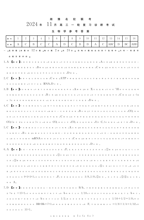 湘豫名校联考2024年11月高三一轮复习诊断考试 生物答案