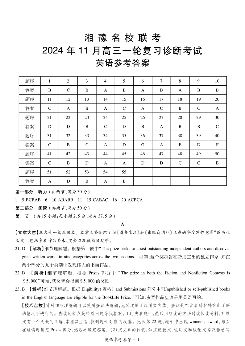 湘豫名校联考2024年11月高三一轮复习诊断考试 英语答案