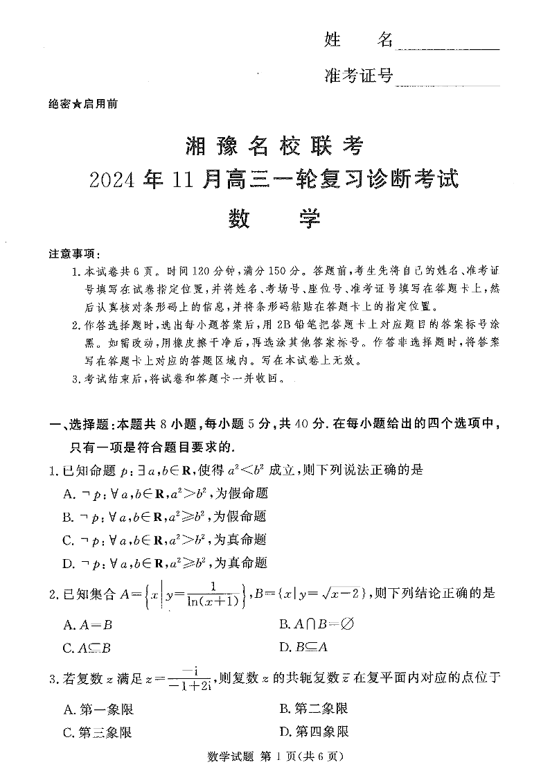 湘豫名校联考2024年11月高三一轮复习诊断考试 数学