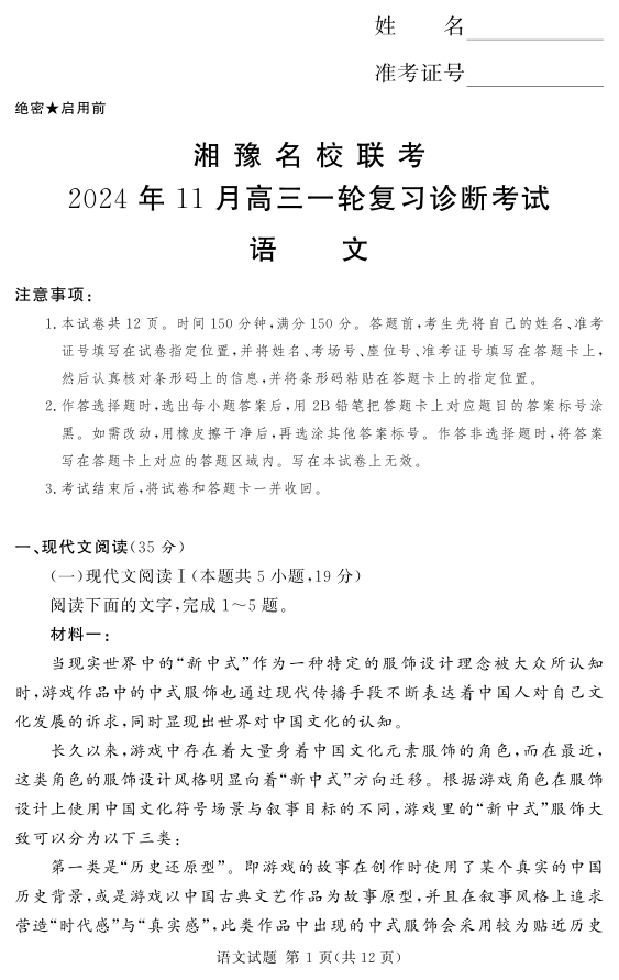 湘豫名校联考2024年11月高三一轮复习诊断考试 语文