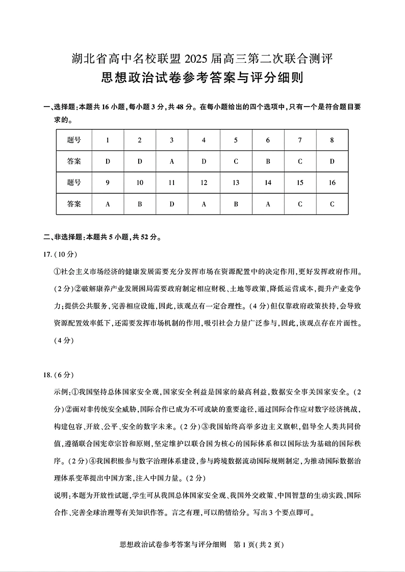 湖北省高中名校联盟2025届高三第二次联合测评 政治答案