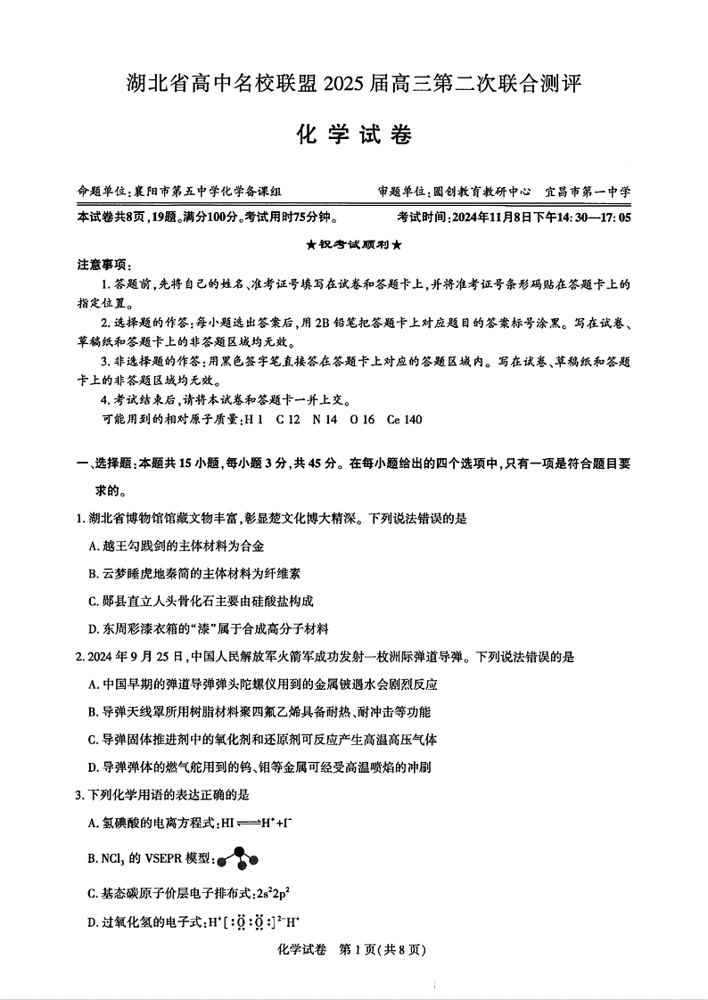 湖北省高中名校联盟2025届高三第二次联合测评 化学