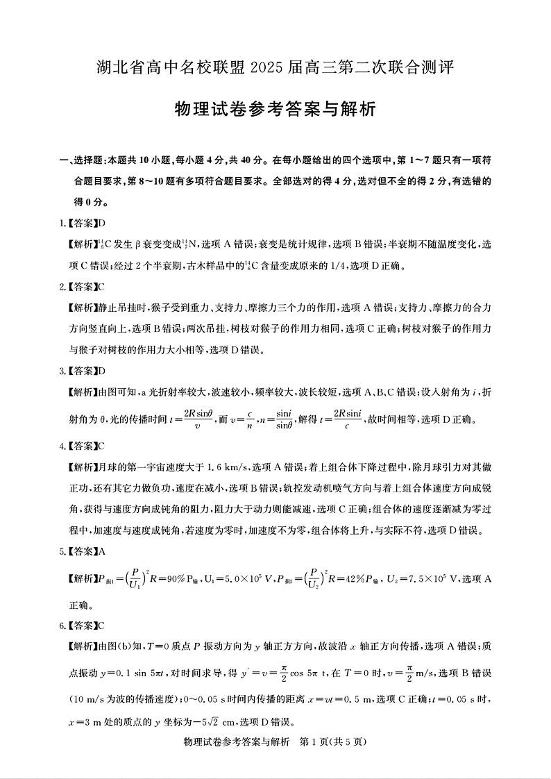 湖北省高中名校联盟2025届高三第二次联合测评 物理答案