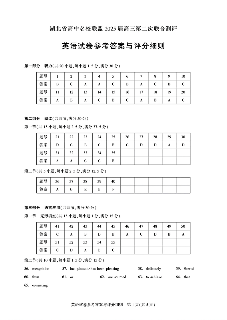 湖北省高中名校联盟2025届高三第二次联合测评 英语答案