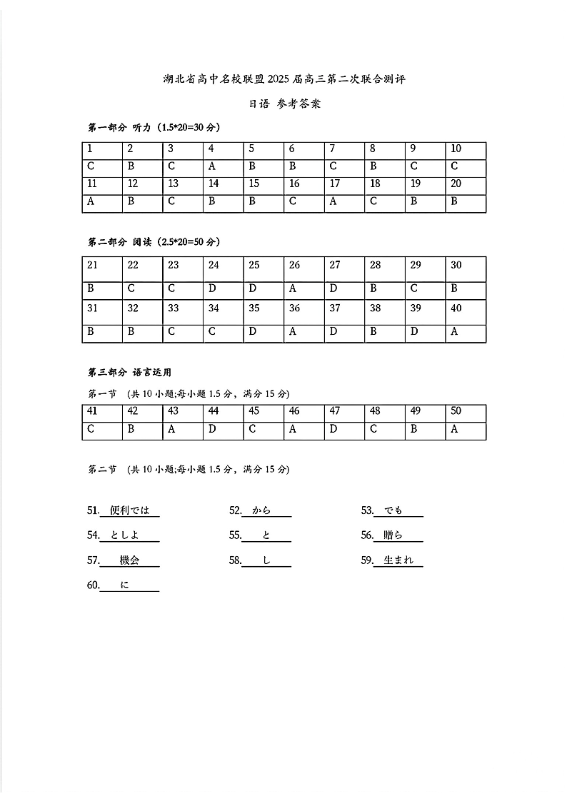 湖北省高中名校联盟2025届高三第二次联合测评 日语答案