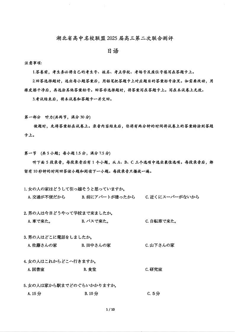 湖北省高中名校联盟2025届高三第二次联合测评 日语