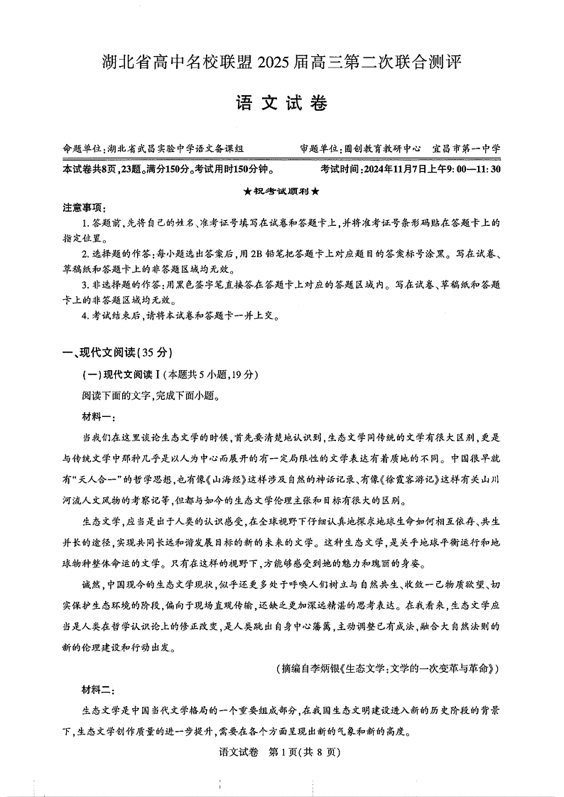 湖北省高中名校联盟2025届高三第二次联合测评 语文