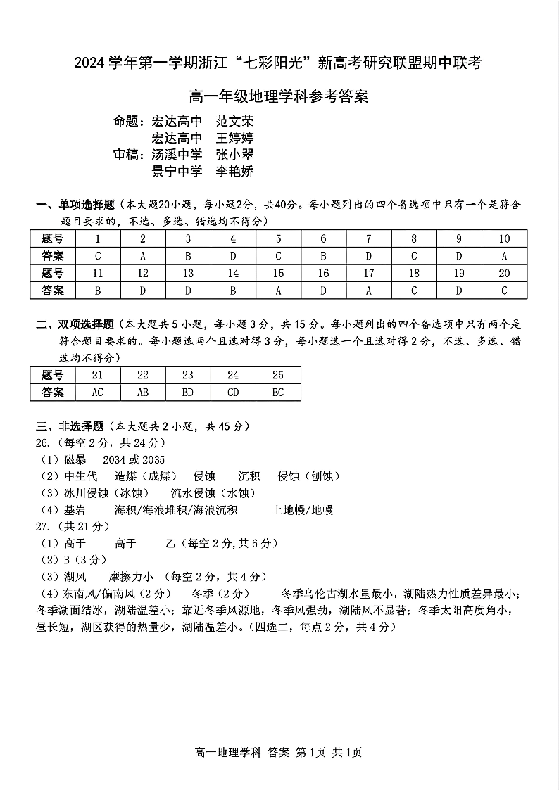 高一年级地理学科参考答案