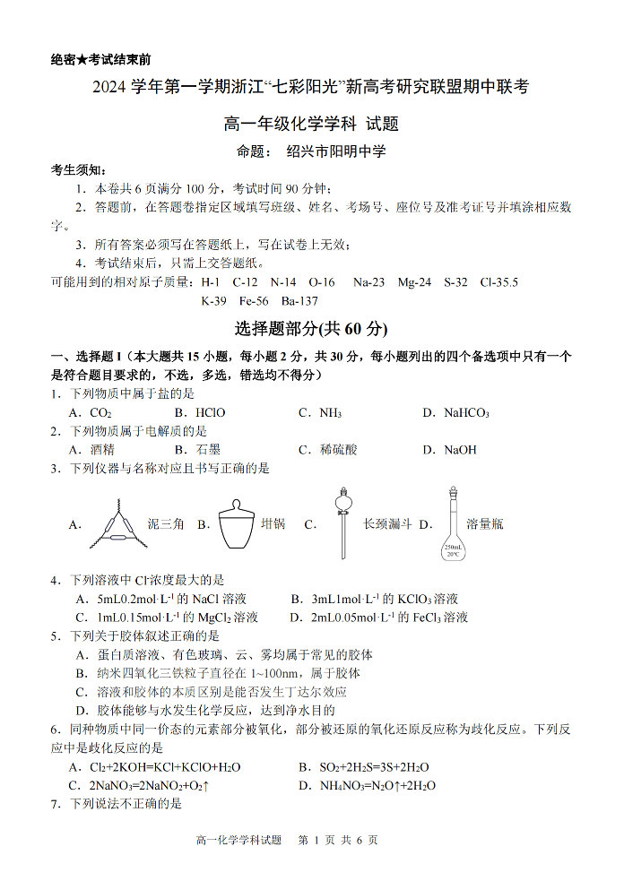 2024学年第一学期浙江“七彩阳光“新高考研究联盟期中联考 化学