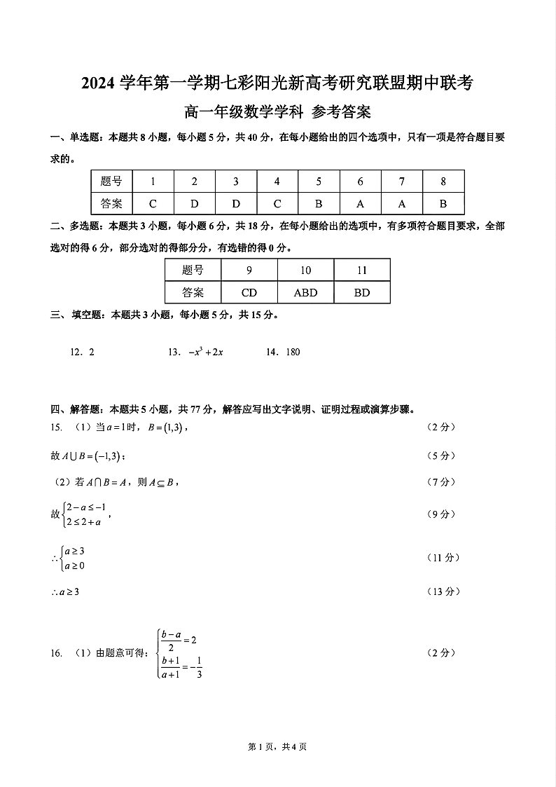 高一年级数学学科参考答案