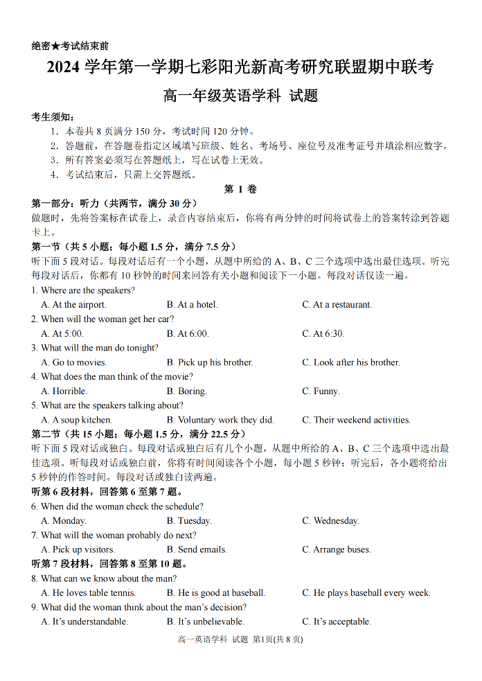2024学年第一学期浙江“七彩阳光“新高考研究联盟期中联考 英语