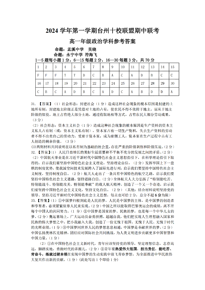 台州十校联盟2024学年高一第一学期期中联考 政治答案
