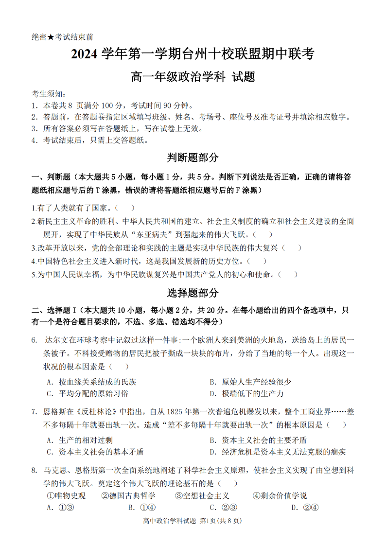 台州十校联盟2024学年高一第一学期期中联考 政治