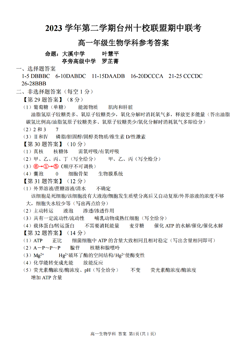台州十校联盟2024学年高一第一学期期中联考 生物答案