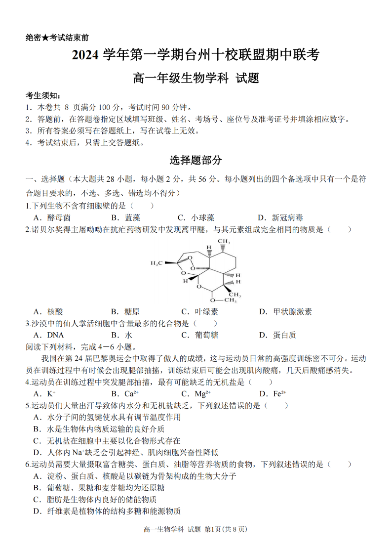 台州十校联盟2024学年高一第一学期期中联考 生物