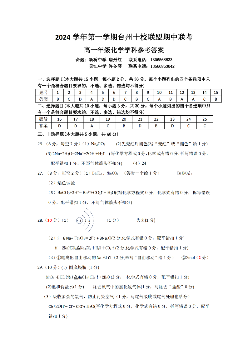 台州十校联盟2024学年高一第一学期期中联考 化学答案