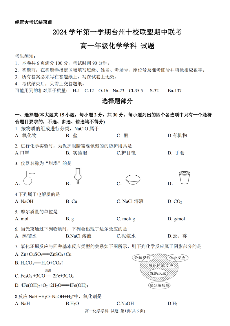 台州十校联盟2024学年高一第一学期期中联考 化学