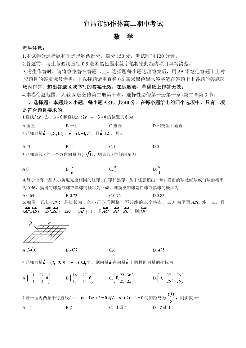 湖北省宜昌市协作体2024-2025学年高二上学期期中考试 数学