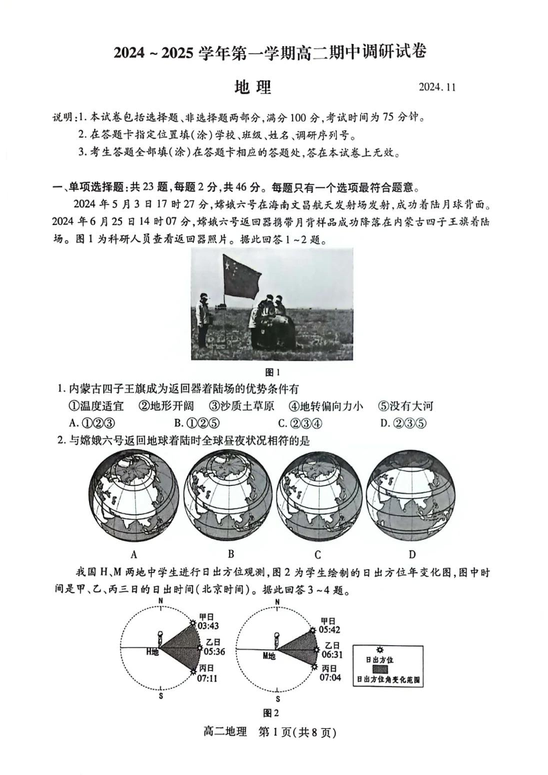 【地理试题】苏州市2024-2025学年高二上学期期中考试