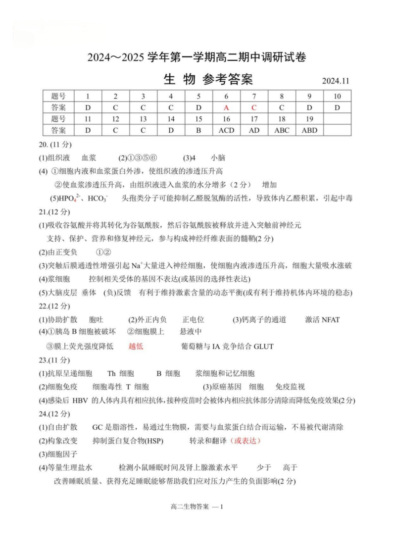 【生物答案】苏州市2024-2025学年高二上学期期中考试.