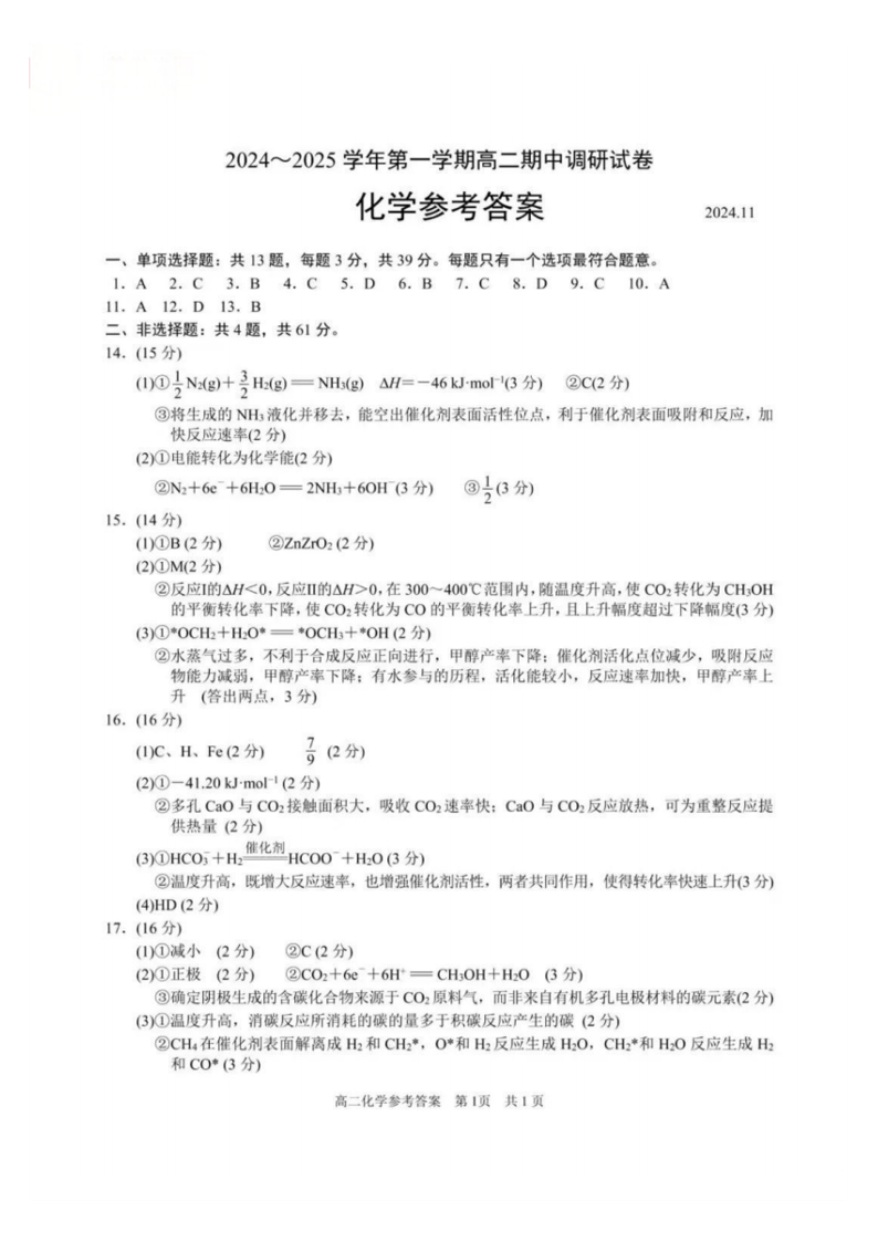 【化学答案】苏州市2024-2025学年高二上学期期中考试