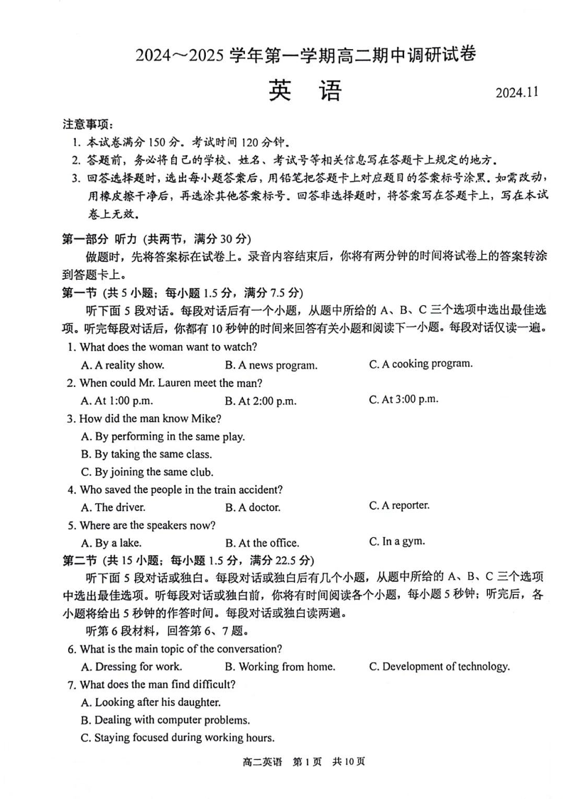【英语试题】苏州市2024-2025学年高二上学期期中考试