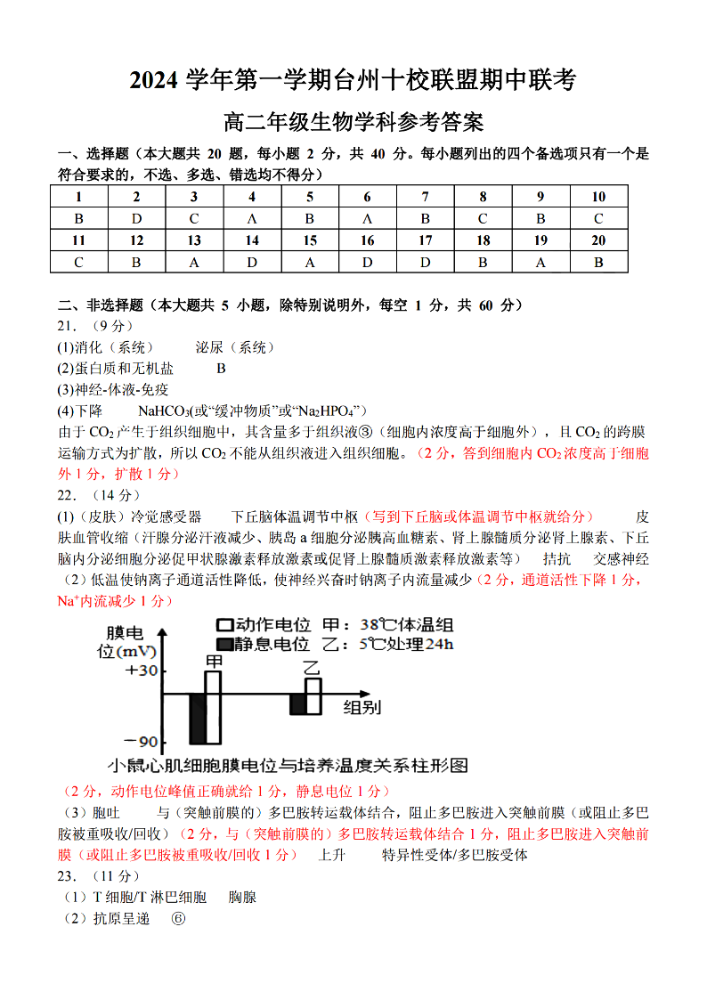 台州十校联盟2024学年高二第一学期期中联考 生物答案