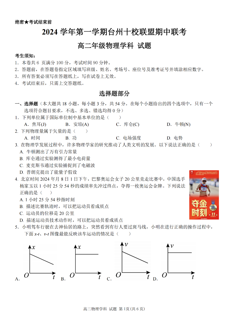 台州十校联盟2024学年高二第一学期期中联考 物理