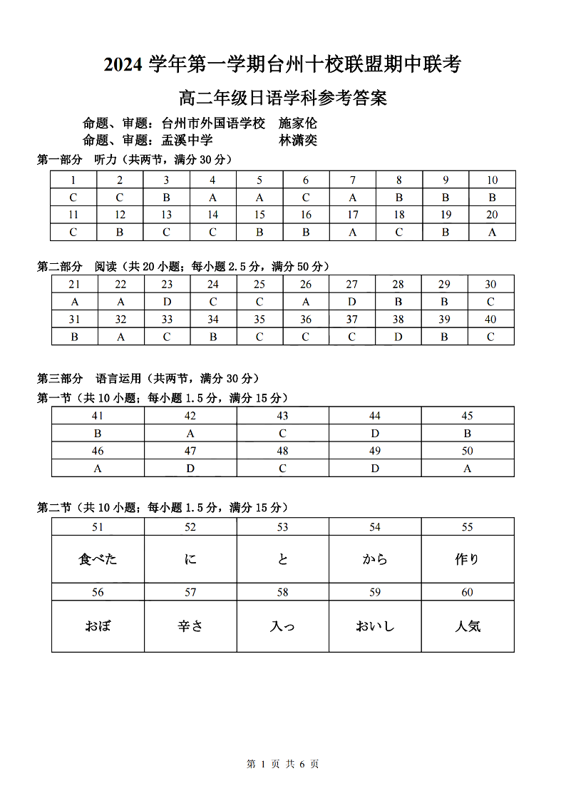 台州十校联盟2024学年高二第一学期期中联考 日语答案
