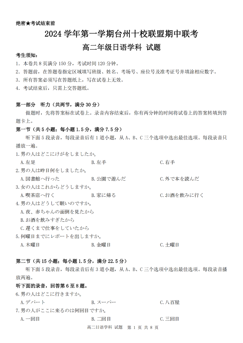 台州十校联盟2024学年高二第一学期期中联考 日语