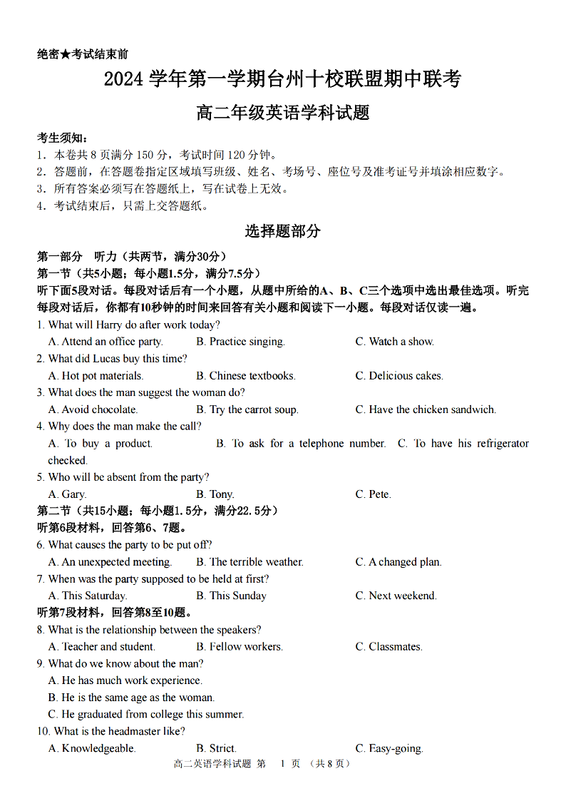 台州十校联盟2024学年高二第一学期期中联考 英语