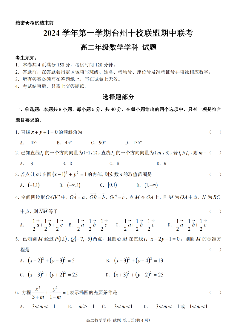 台州十校联盟2024学年高二第一学期期中联考 数学