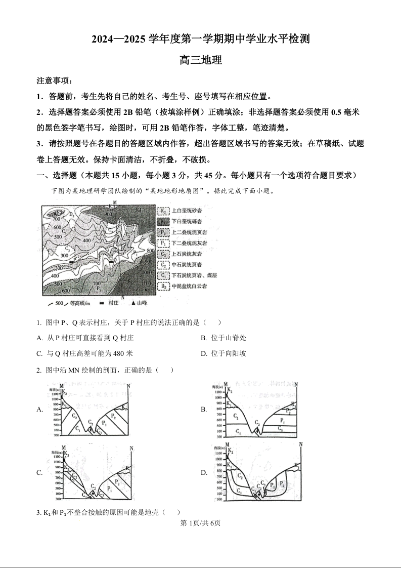 山东省烟台市2024-2025学年度第一学期期中学业水平诊断 地理