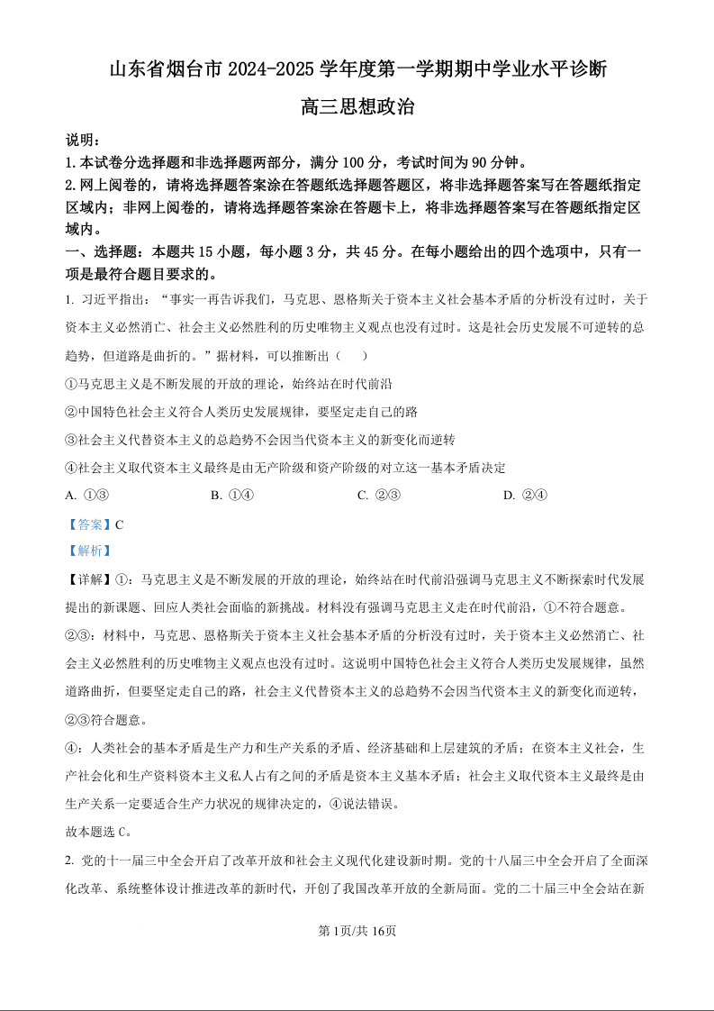山东省烟台市2024-2025学年度第一学期期中学业水平诊断 政治答案