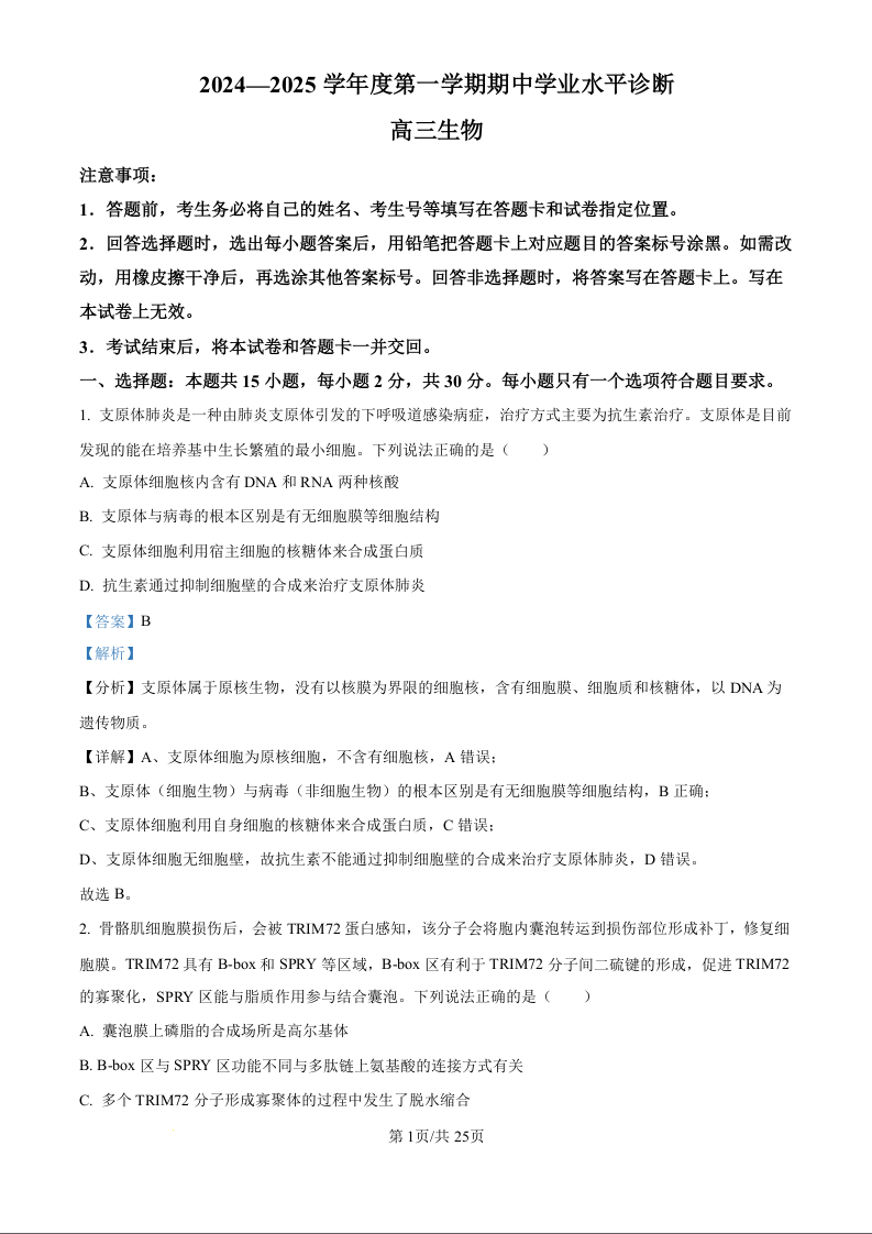 山东省烟台市2024-2025学年度第一学期期中学业水平诊断 生物答案