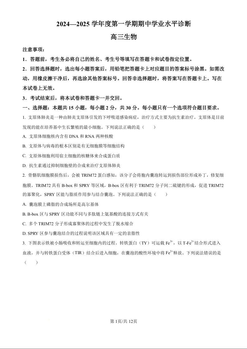 山东省烟台市2024-2025学年度第一学期期中学业水平诊断 生物