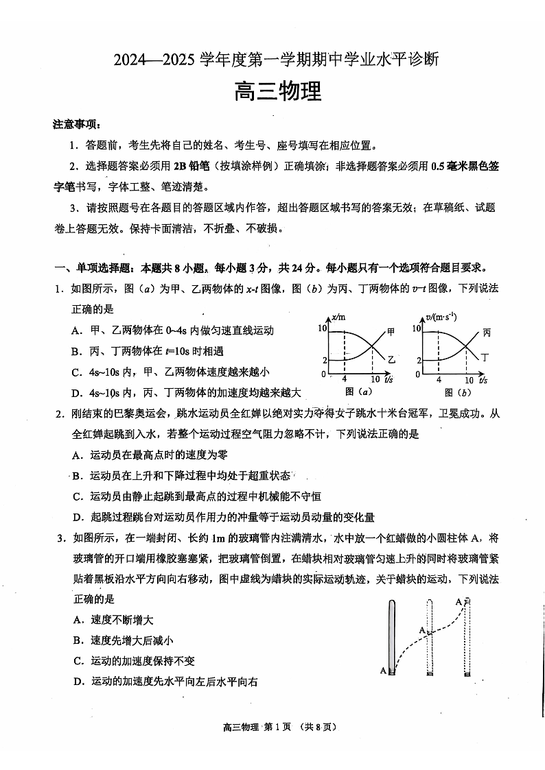 山东省烟台市2024-2025学年度第一学期期中学业水平诊断 物理