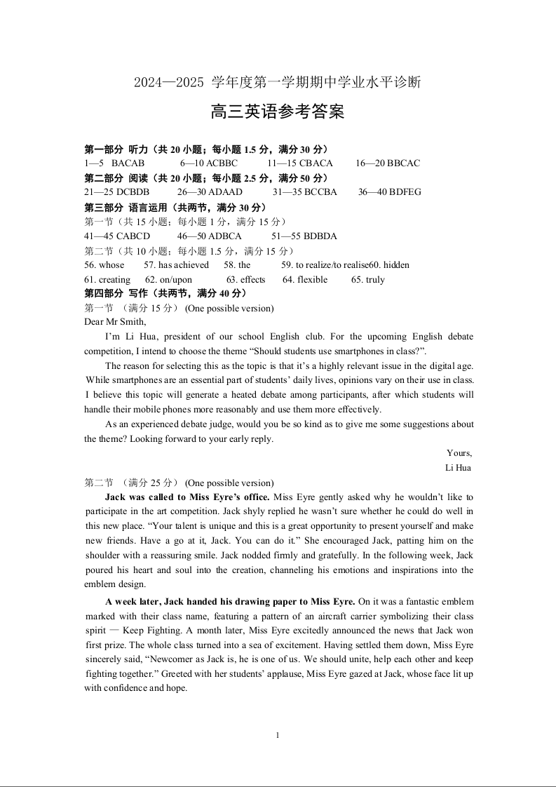 山东省烟台市2024-2025学年度第一学期期中学业水平诊断 英语答案