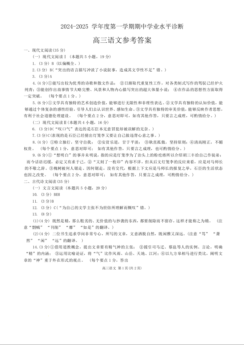 山东省烟台市2024-2025学年度第一学期期中学业水平诊断 语文答案