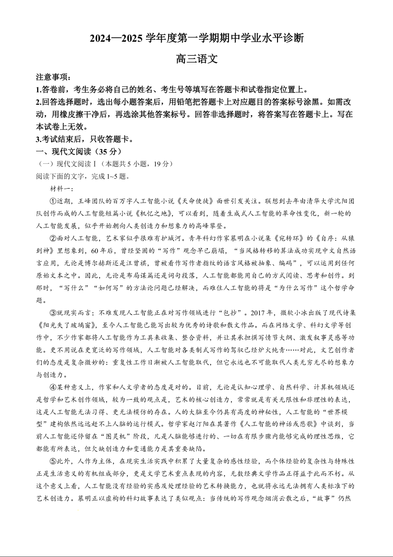 山东省烟台市2024-2025学年度第一学期期中学业水平诊断 语文